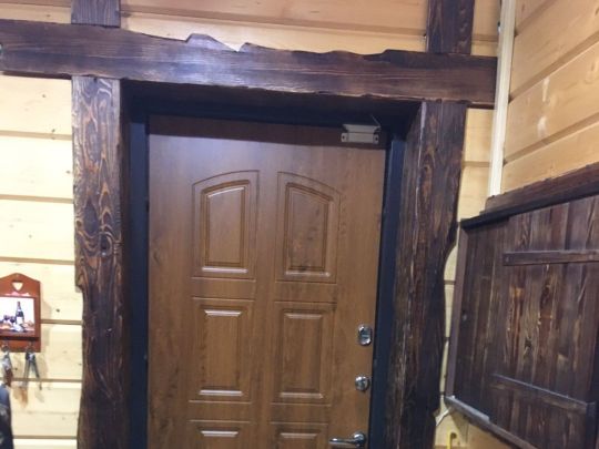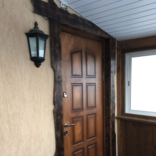 Мы можем предложить облагородить проем декоративными деревянными элементами. Деревянные откос и наличники обжигаются, покрываются морилкой в подходящий Вам цвет. Все вырезы и прочее мастер обговаривает с Вами на месте - делаем то Вы пожелали.